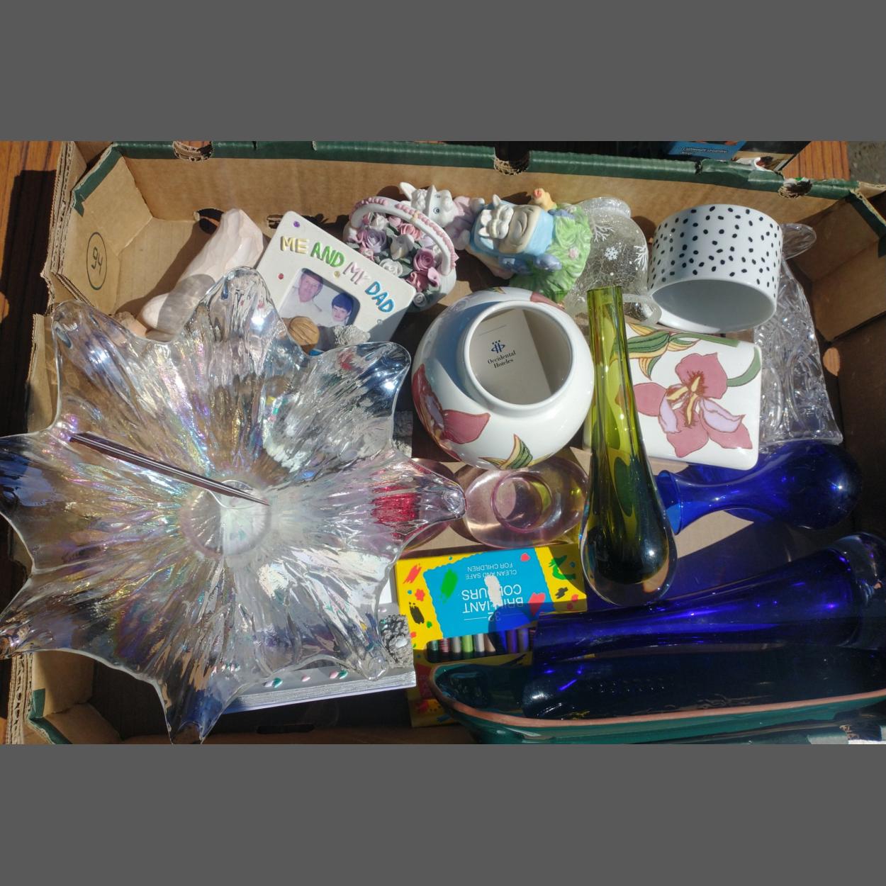 A collection of ceramics to include a nice garlic glazed terracotta dish and beautiful heavy single stem coloured glass vases etc etc