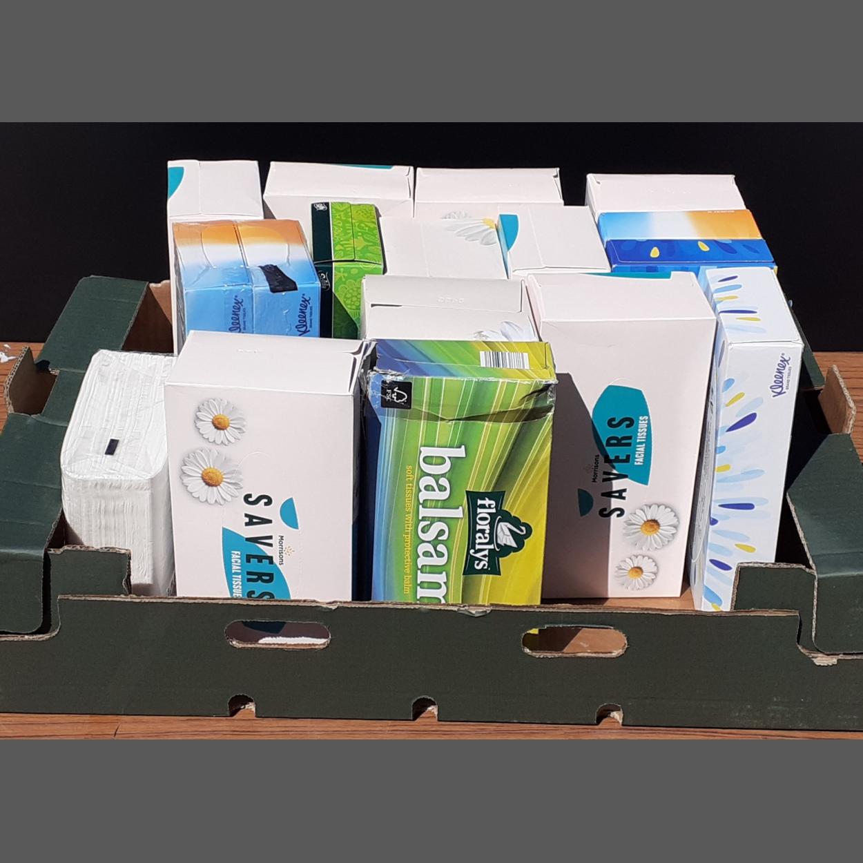 A large box containing loads of new unopened boxes of tissues etc