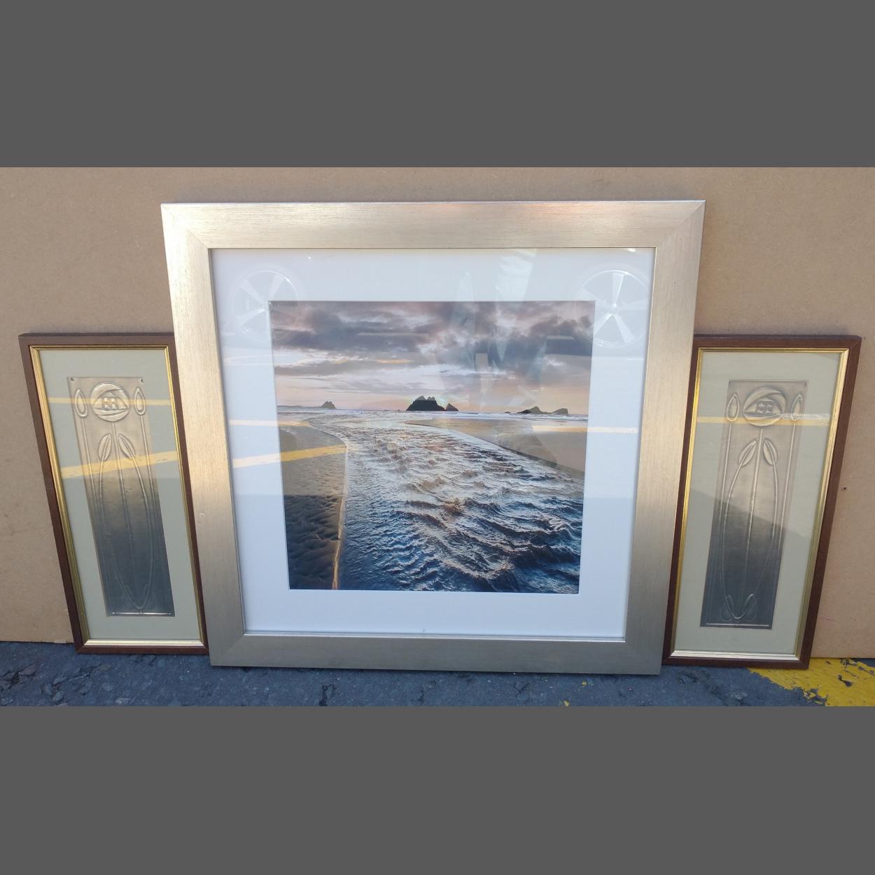 RENNIE MACKINTOSH style framed art 6” x 13.5” with a modern art framed seascape 18” x 18” all approx dimensions