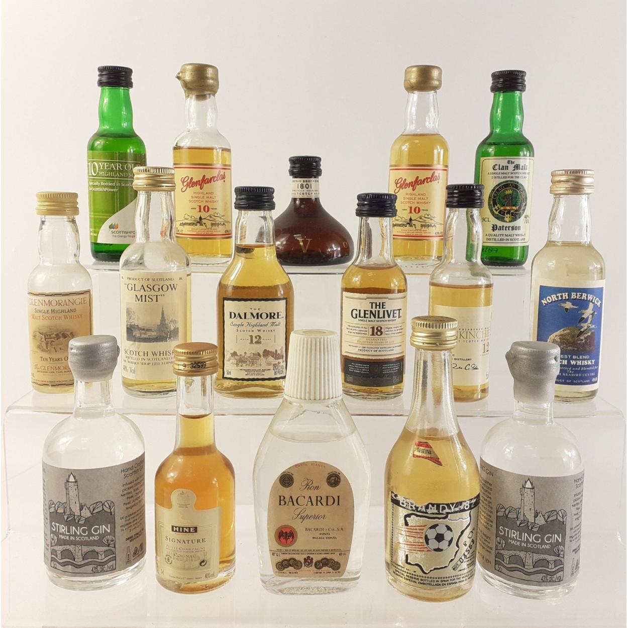 A collection of miniature whiskies to include GLENFARCLAS, GLENKINCHIE, NORTH BERWICK, GLASGOW MIST, DALMORE, SCOTTISH POWER, GLENLIVET, plus miniature Bacardi, Stirling Gin, Hine Cognac, Volve etc