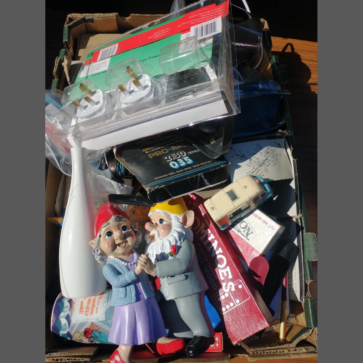 A mixed household lot to include a gnome model and dominoes etc etc etc