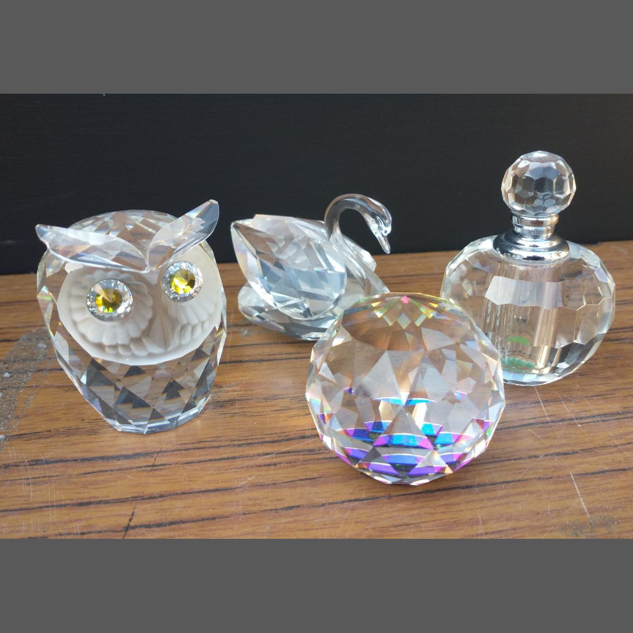 Four SWAROVSKI crystal glass ornaments to include an owl, a swan and two paper weights