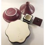 A lidded TAJINE in deep purple by MASON CASH 28cm approx. With a good quality French flan dish (minor chip to rim) and a fun Liquorice Allsorts style jar.