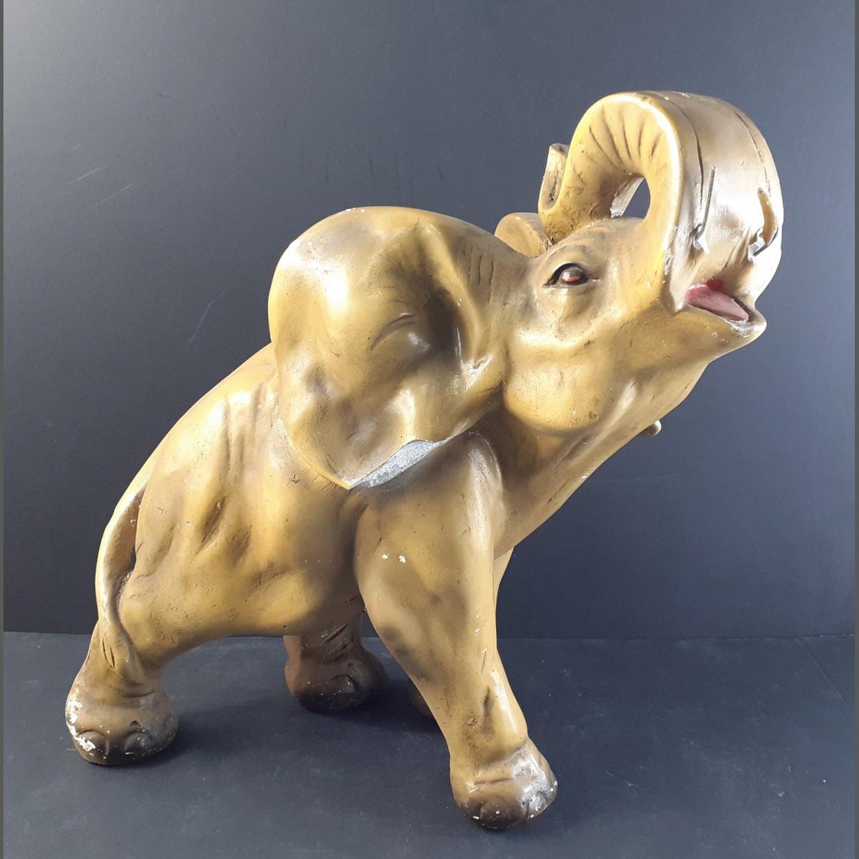 A wonderful vintage plaster model of an elephant with trunk raised. Some damage noted to tusks, ears etc. but still a wonderful piece. Stands 36cm tall approx.