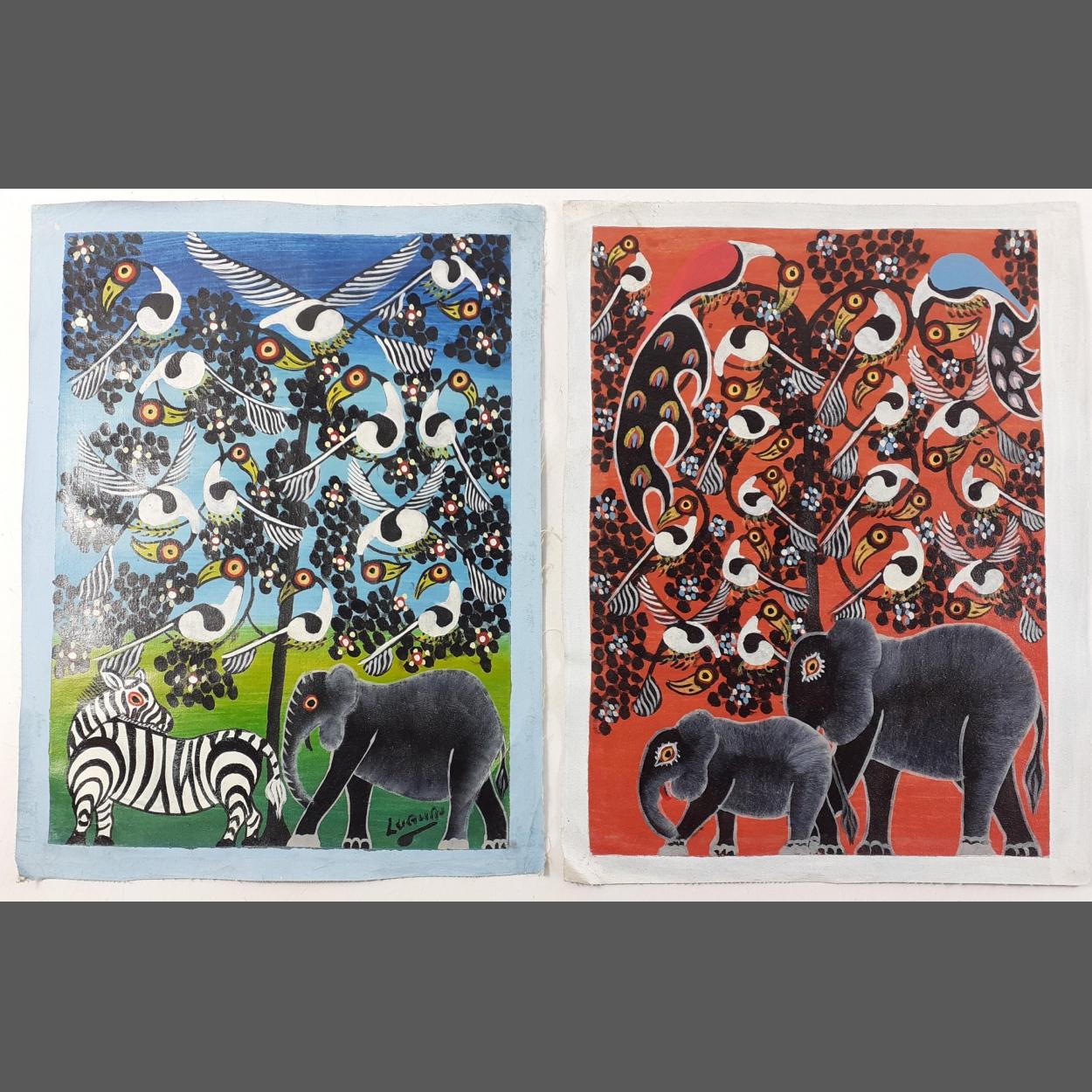 Two TINGATINGA original art pieces from TANZANIA one signed. Original pieces purchased by the vendor more than twenty years ago direct from the artist. Colourful, vibrant and accomplished these are truly beautiful pieces reflecting the wildlife of the area, each 35cm x 25cm ready for framing.