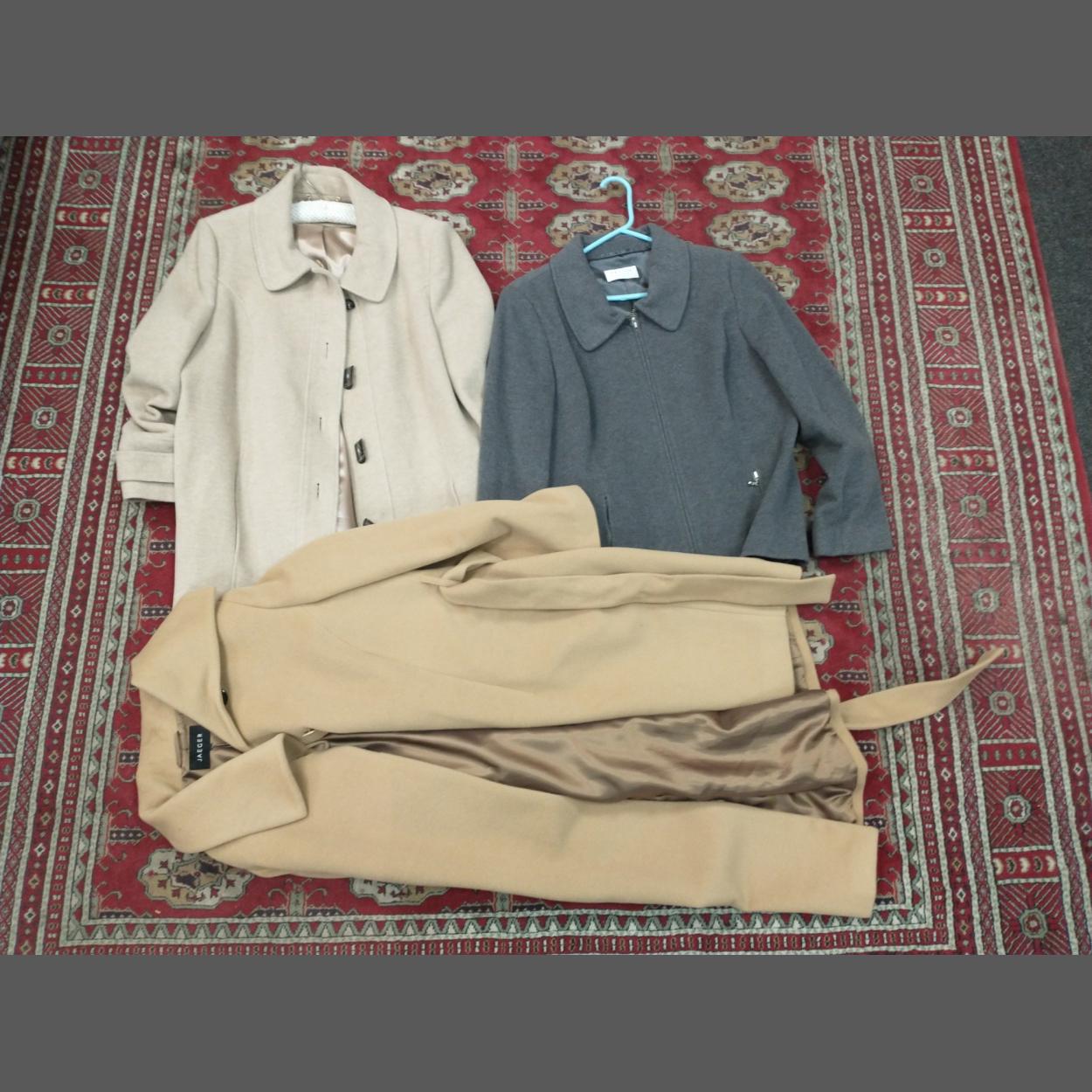 A PRECIS PETIT grey Ladies zip up wool/cashmere blend Fleece size 16. A Ladies JAEGER wool / angora blend coat and a CC branded ladies coat. All three in good clean well stored condition