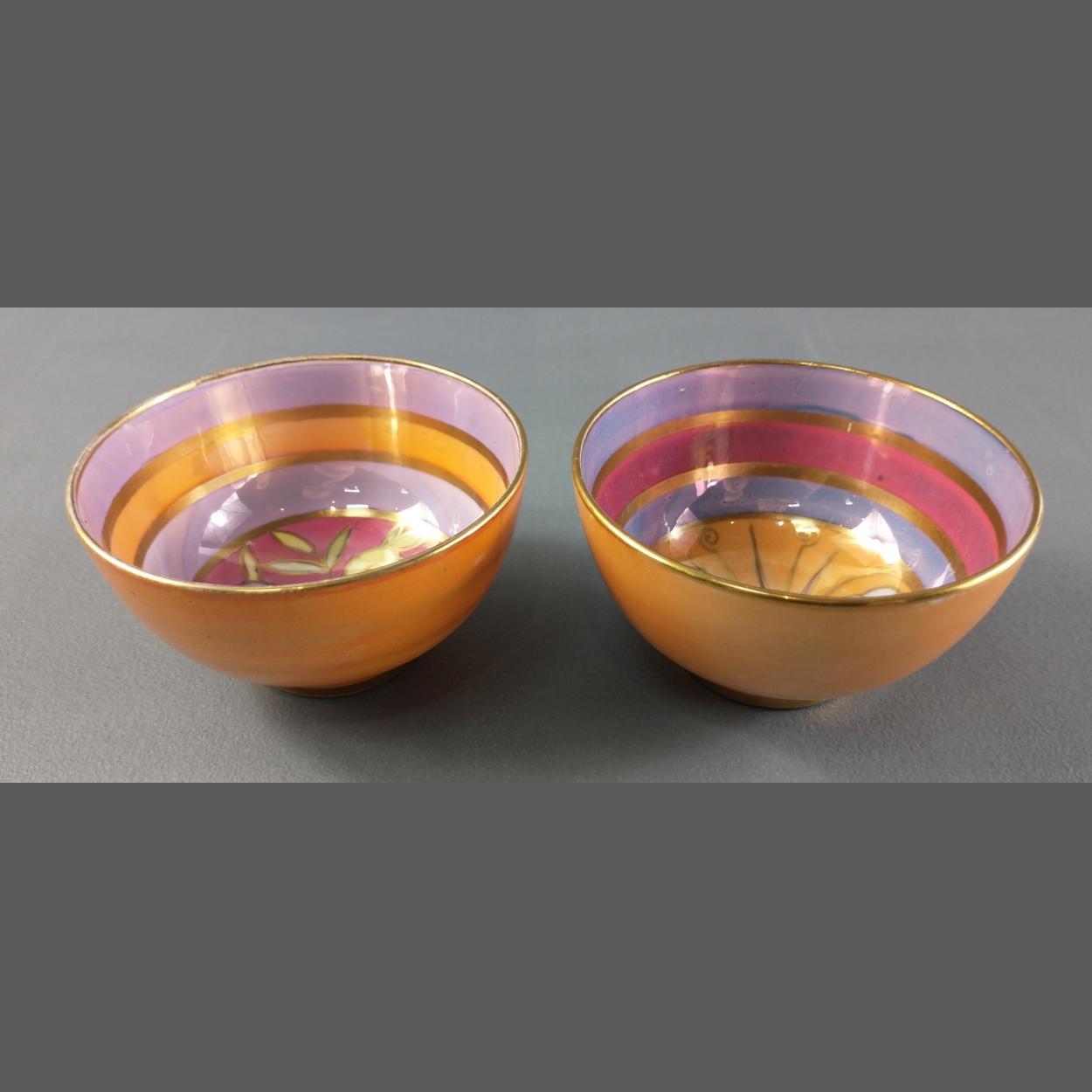 A pair of PARAGON Rainbow lustre saki dishes (rd no 716642). Diameter 8cm. Small colour defect on one.