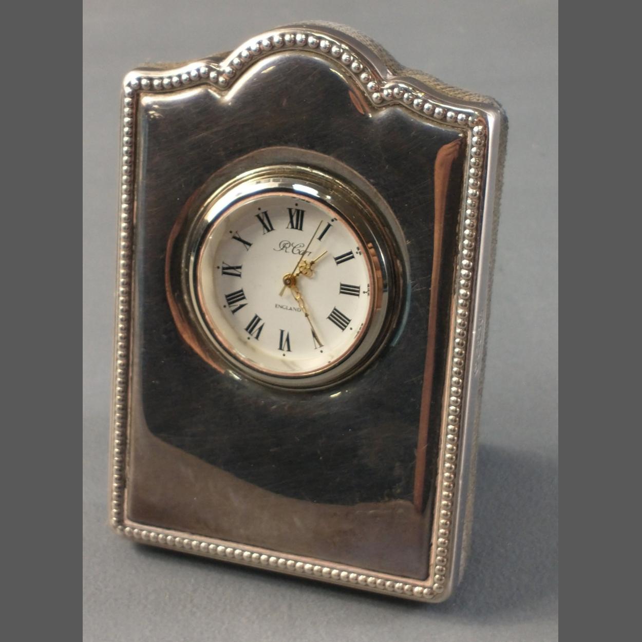 A silver hallmarked (Sheffield 1994) quartz clock by R CARR, 6cm approx