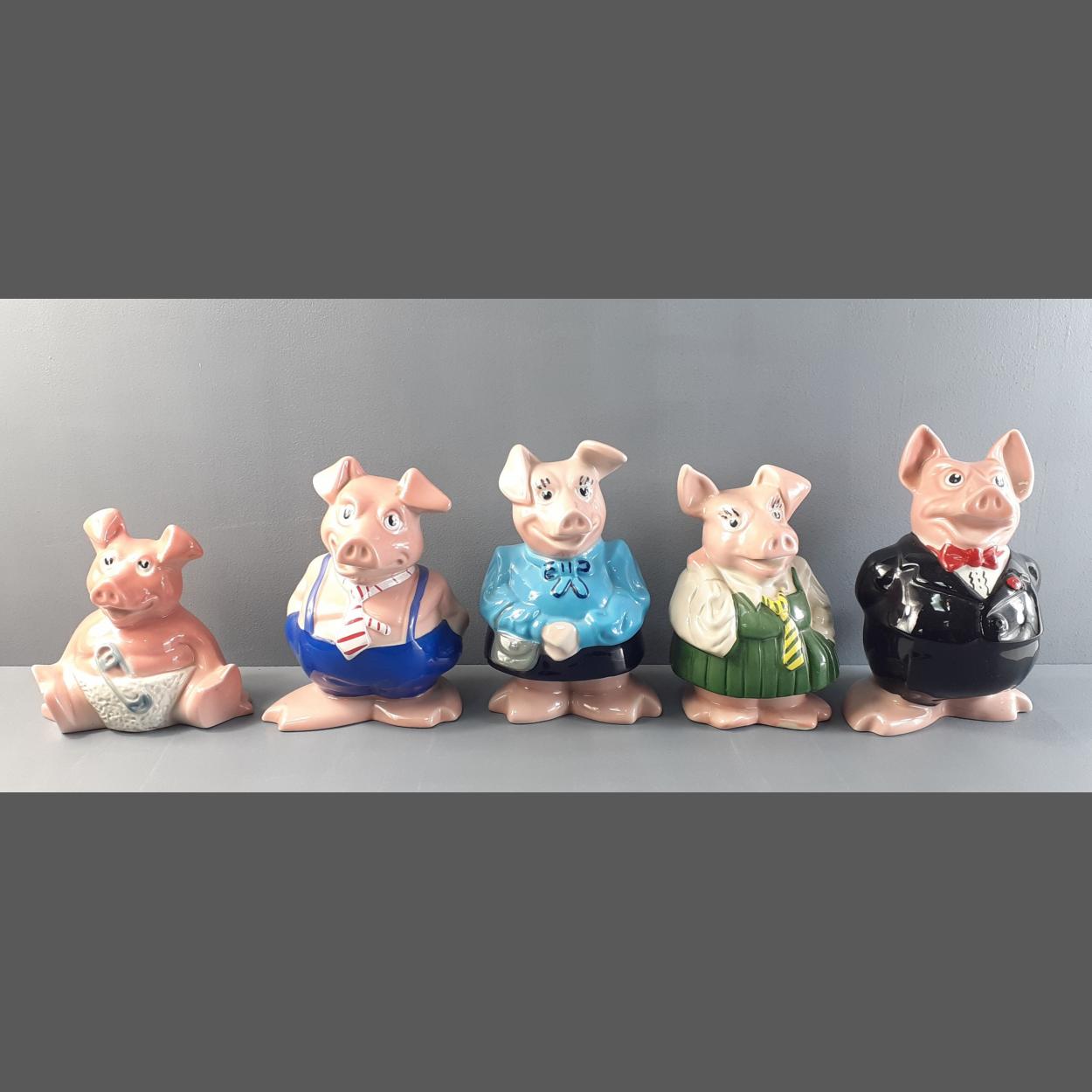 A complete set of five Natwest glazed ornamental ceramic piggy banks by WADE - no chips or signs of damage repair - tallest figure 15cm approx