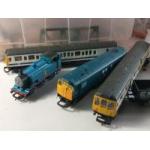 A large collection of HORNBY rolling stock carriages etc, scene-set-up trees, THOMAS THE TANK and BRITISH RAIL 8H44 diesel class blue locomotive and a quantity of track etc