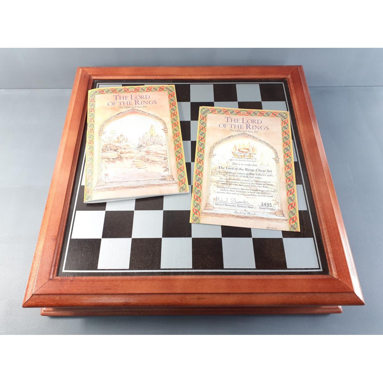 THE LORD OF THE RINGS J R R Tolkien Official FANTASY chess set with PEWTER & SILVER made chess pieces - serial No 3495 - comes complete with chess board - dimensions square 42cm x depth 78cm approx