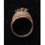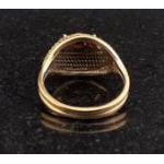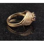 A 375 stamped SUBSTANTIAL ring with 3 raised small round-cut GARNETS - dimension of garnets 0.4cm diameter approx - ring size M - gross weight 3.56g approx