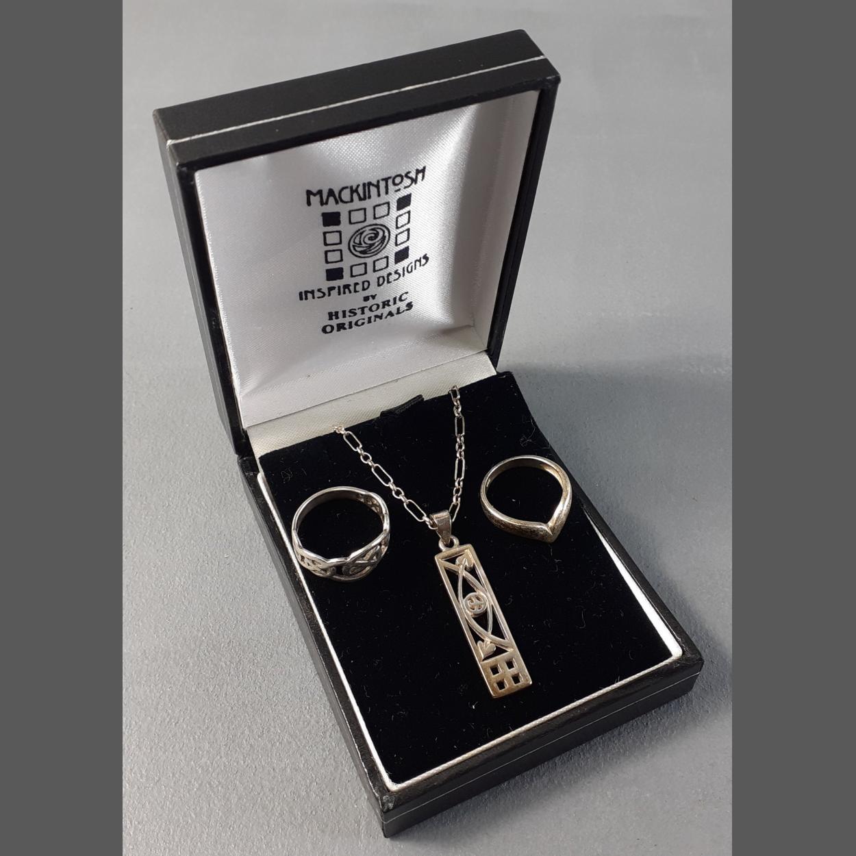 A 925 stamped RENNIE MACKINTOSH design pendant on chain, a 925 wishbone ring size I/J and a white metal Celtic knot ring size K/L - silver weight 7.70g approx