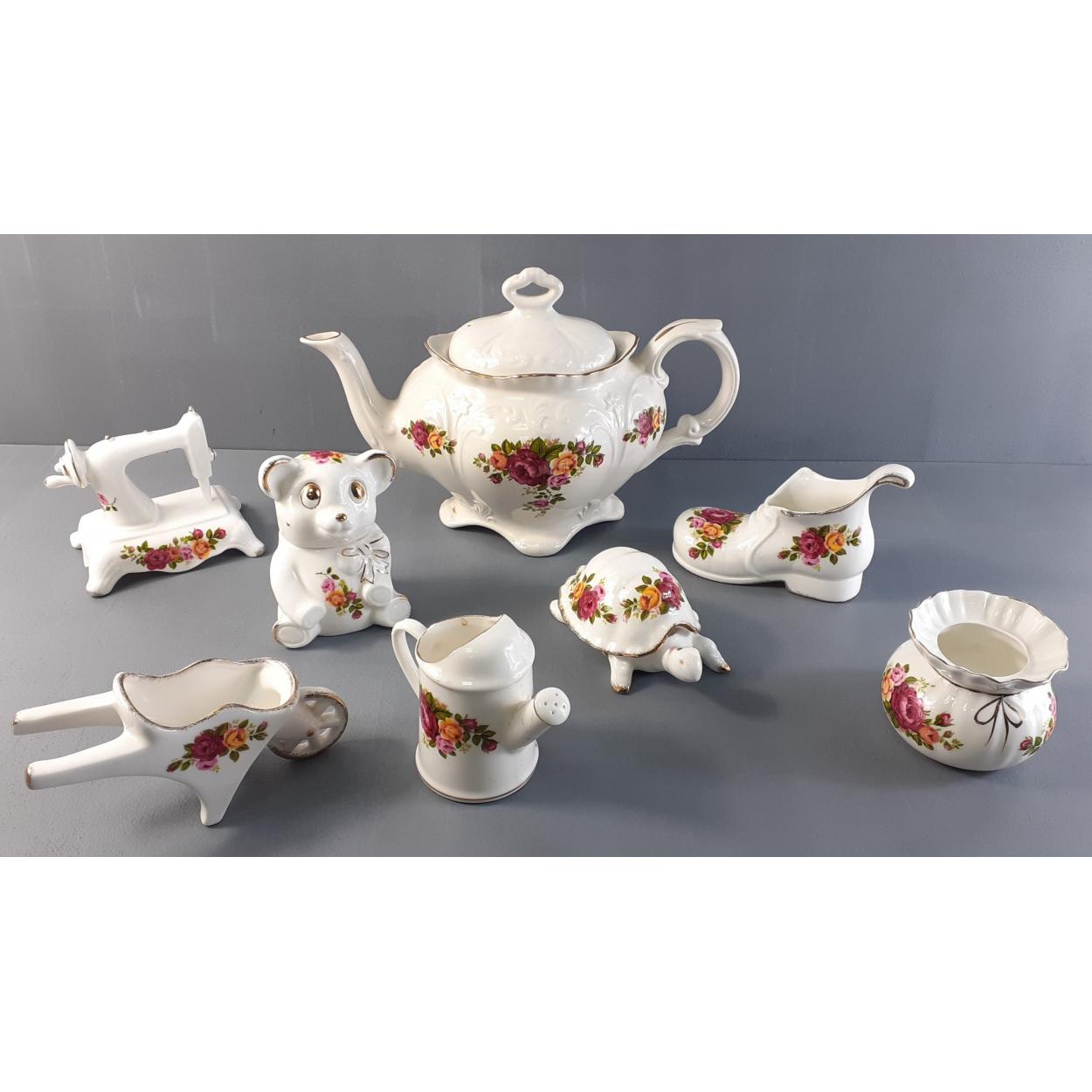COUNTRY ROSE FINE BONE CHINA to include a boot, a teapot, a watering can, teddy bear and a watering can etc