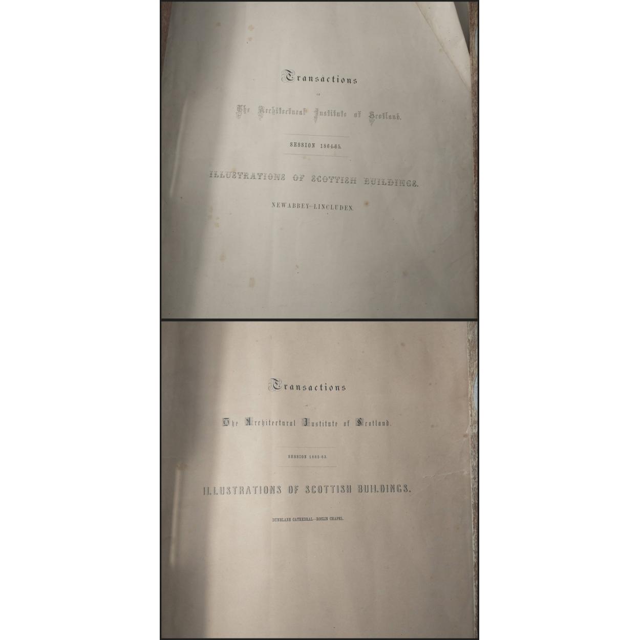 Fascinating history - TRANSACTIONS of THE ARCHITECTURAL INSTITUTE of SCOTLAND 1862-63 - Illustrations of DUNBLANE CATHEDRAL and ROSLIN CHAPEL. Also from 1864-65 Illustrations of NEWABBEY - LINCLUDEN. Condition frail but useable.