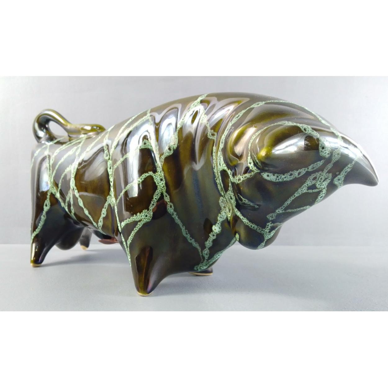 A vintage TRENTHAM artware green bull money bank by Colin Melbourne - dimensions 30cm length x 15cm height x 7cm approx - no chips cracks or signs of damage repair