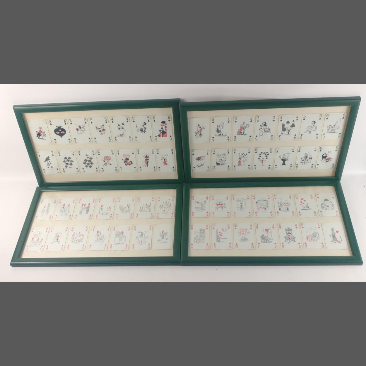 Four framed (48 29cm approx) card sets from THE CARTOONIST PACK of cards. This pack of cards was produced by four Fleet Street cartoonists - Bernard Cookson, Michael Heat, Mac (Stan McMurty), and Keith Waite in 1980. Great for a man cave.