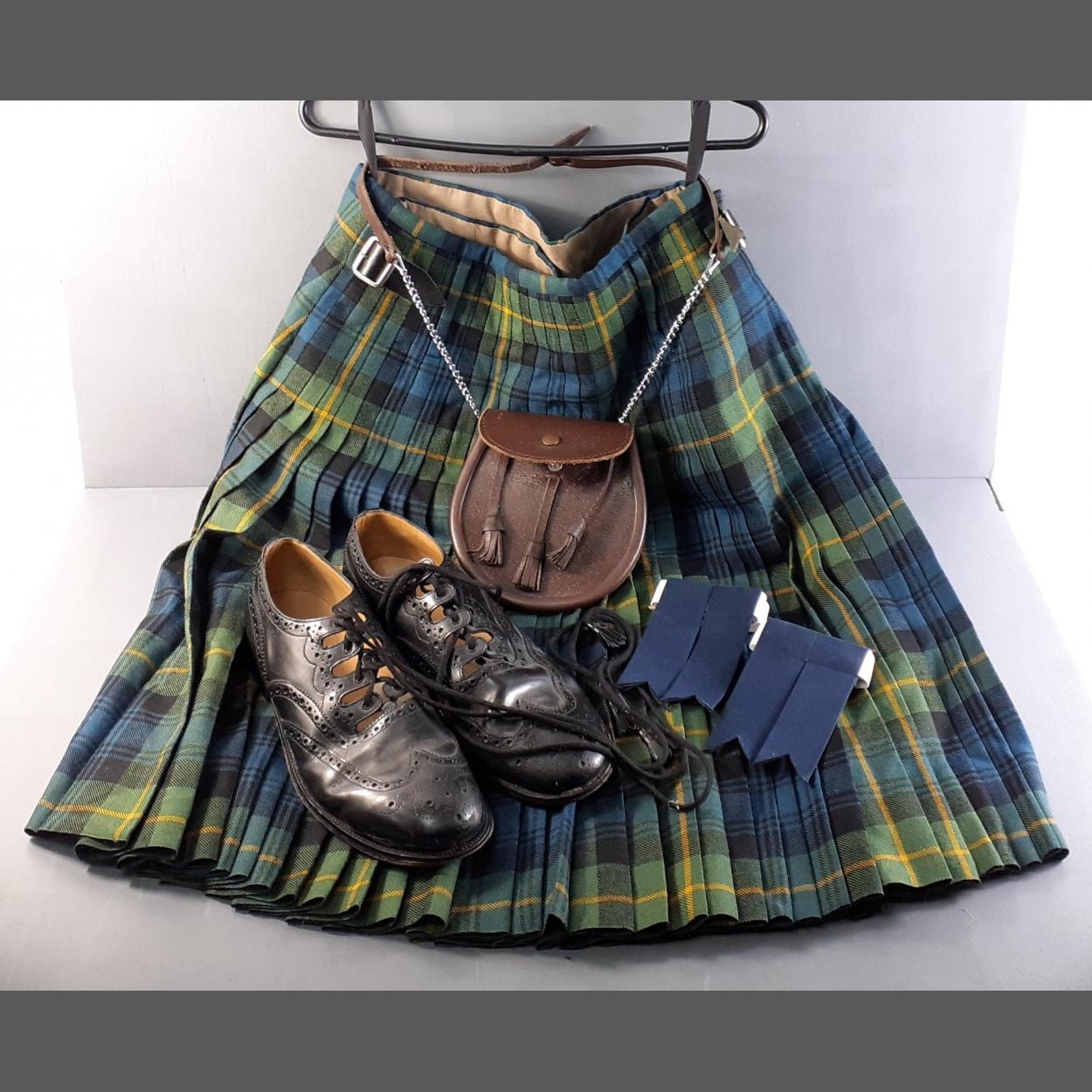 A gent's 100% pure new wool kilt in the Gordon tartan, waist approx 32in, made by HUGH MacPHERSON of Edinburgh, plus a pair of brogues size 10½ slightly worn, a brown leather day sporran, and a pair of flashes,