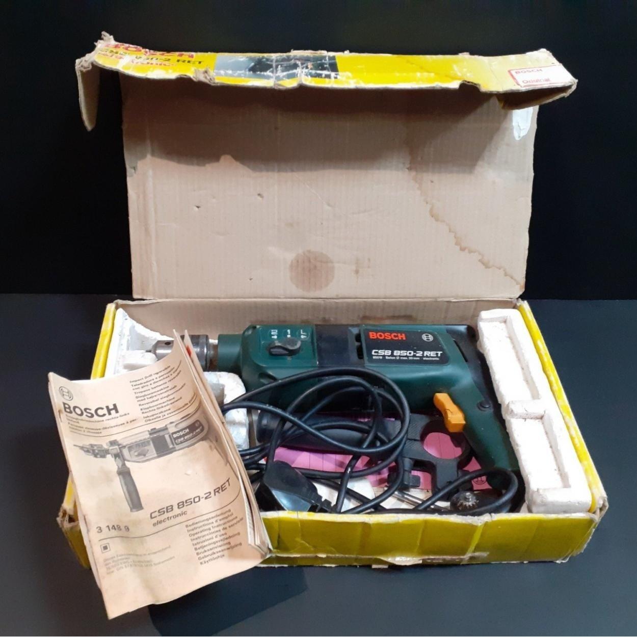 A BOSCH impact drill model CSB 850-2 RET 850 W, max 20mm. All within original box appears in good working condition.
