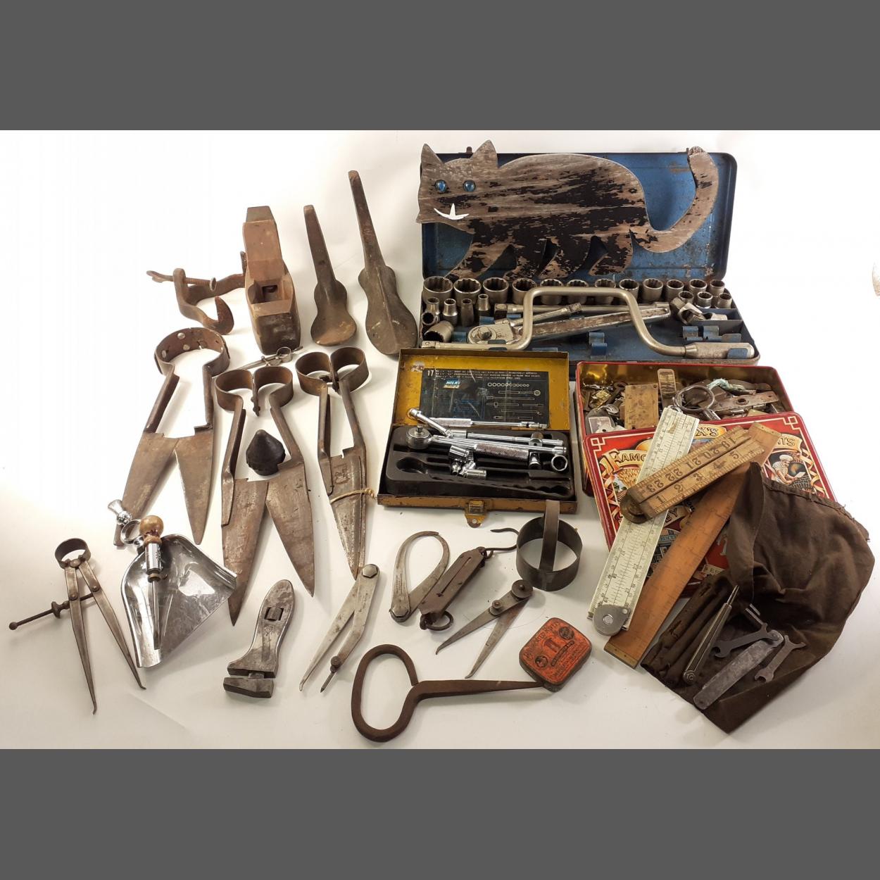 A mixed box of tools to include cobblers' lasts, planes, socket set, sheep shears, vintage rules etc