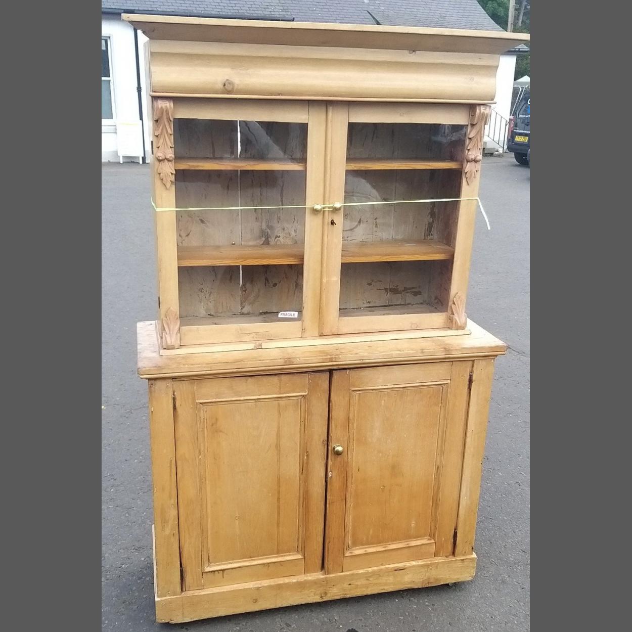 VICTORIAN ANTIQUE PINE two glazed door cabinet with two large cupboard doors - fabulous patina & nicely hand carved features and comes in two pieces for ease of transport etc - 108cm width x 45cm depth x 1.7m height approx