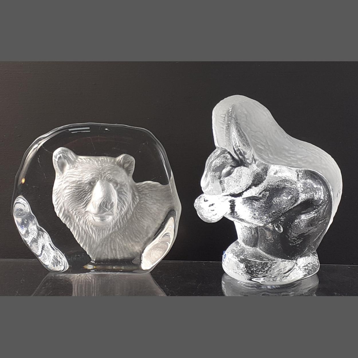 Carved inner bear crystal glass paperweight height 8.5cm approx with also a glass squirrel height 10cm approx paperweight