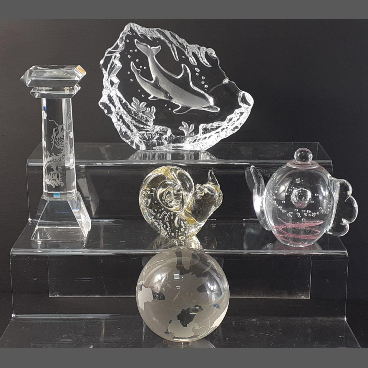 A collection of 5 glass paperweights to include a world globe - a small snail 6cm height, a swimming dolphin paperweight, a columnar dragon and a teapot height 8.5cm approx