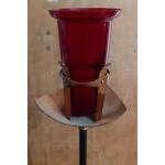 A Gothic style copper topped candle stand with cranberry glass shade (small chip), stands 180cm tall