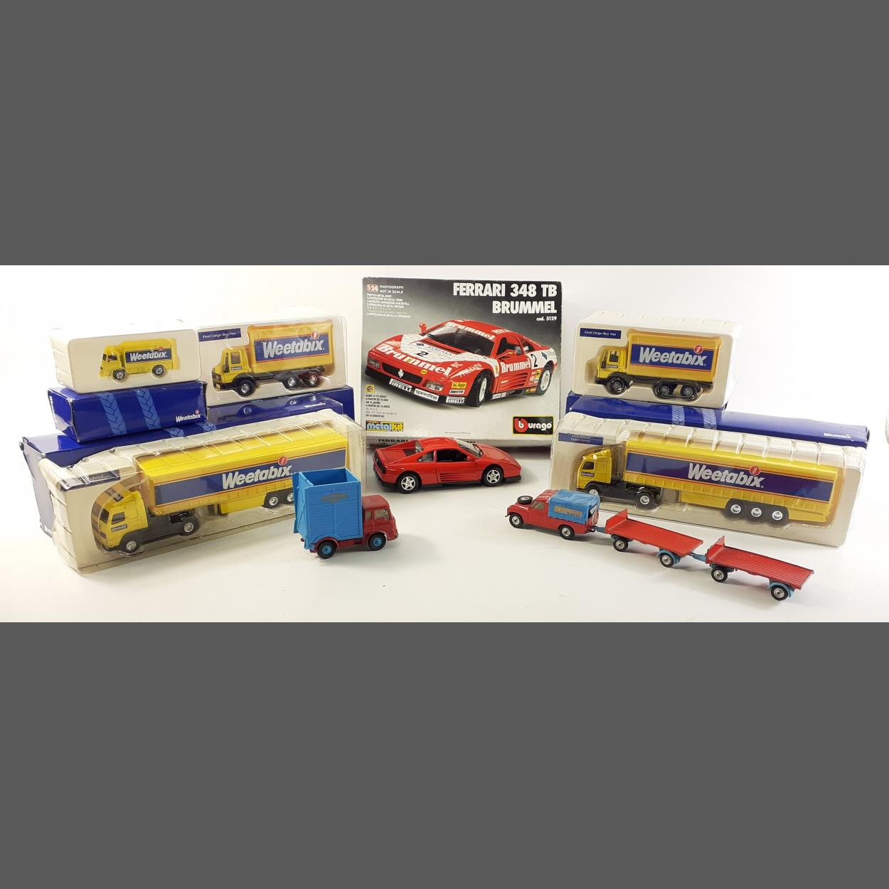 A small collection of boxed WEETABIX cars to include a Ford Cargo Box Van x 2, a Leyland Truck , an Articulated Volvo Lorry x 2 and 2 Chipperfield's vehicles and 2 trailers. Also a made-up metal bodied Burago Ferrari.
