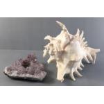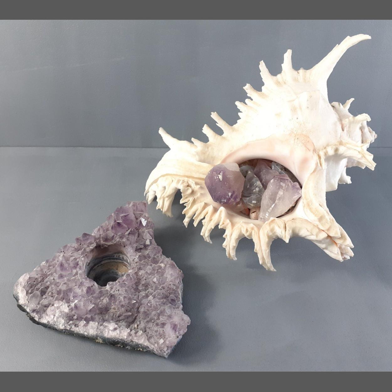 A large conch shell, 20cm tall approx, filled with amethyst chunks and also a rough triangular amethyst geode, 13cm across, carved as a candle holder