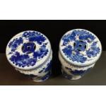 A pair of impressive blue and white Oriental stools, each 40cm tall, 27cm width approx. Have some faint household paint marks