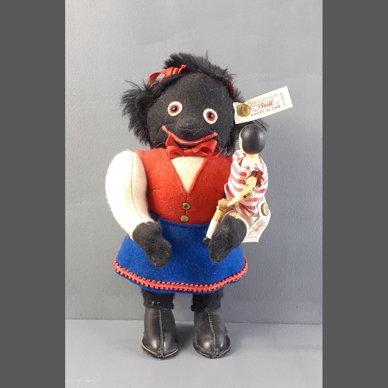 Unusual STEIFF Molli Dolli and peg doll, both with Steiff buttons. The peg doll is missing its right arm. Doll stands 20cm tall approx. The certificate is present.