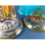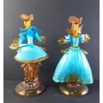 Two glass figures in the style of 18th century fashionistas, each approx 31cm high. The lady is damage repaired.