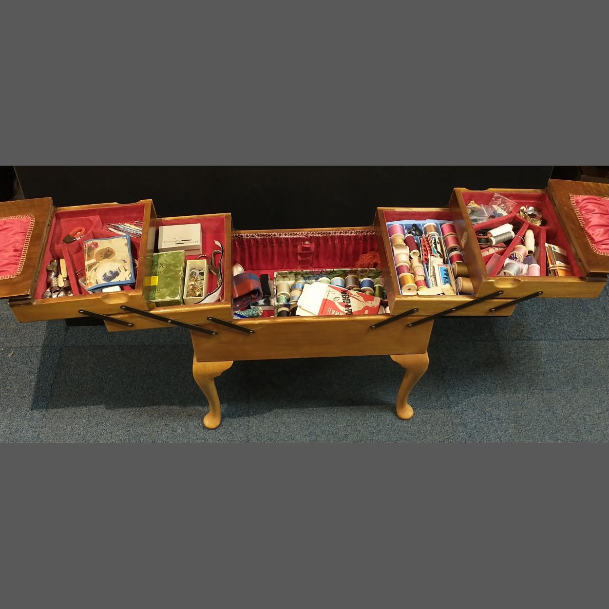 A FABULOUS EXAMPLE of a cantilever sewing table FILLED with vintage HABERDASHERY items! - SO INTERESTING! - dimensions 53cm height x 50cm width x 26cm depth approx