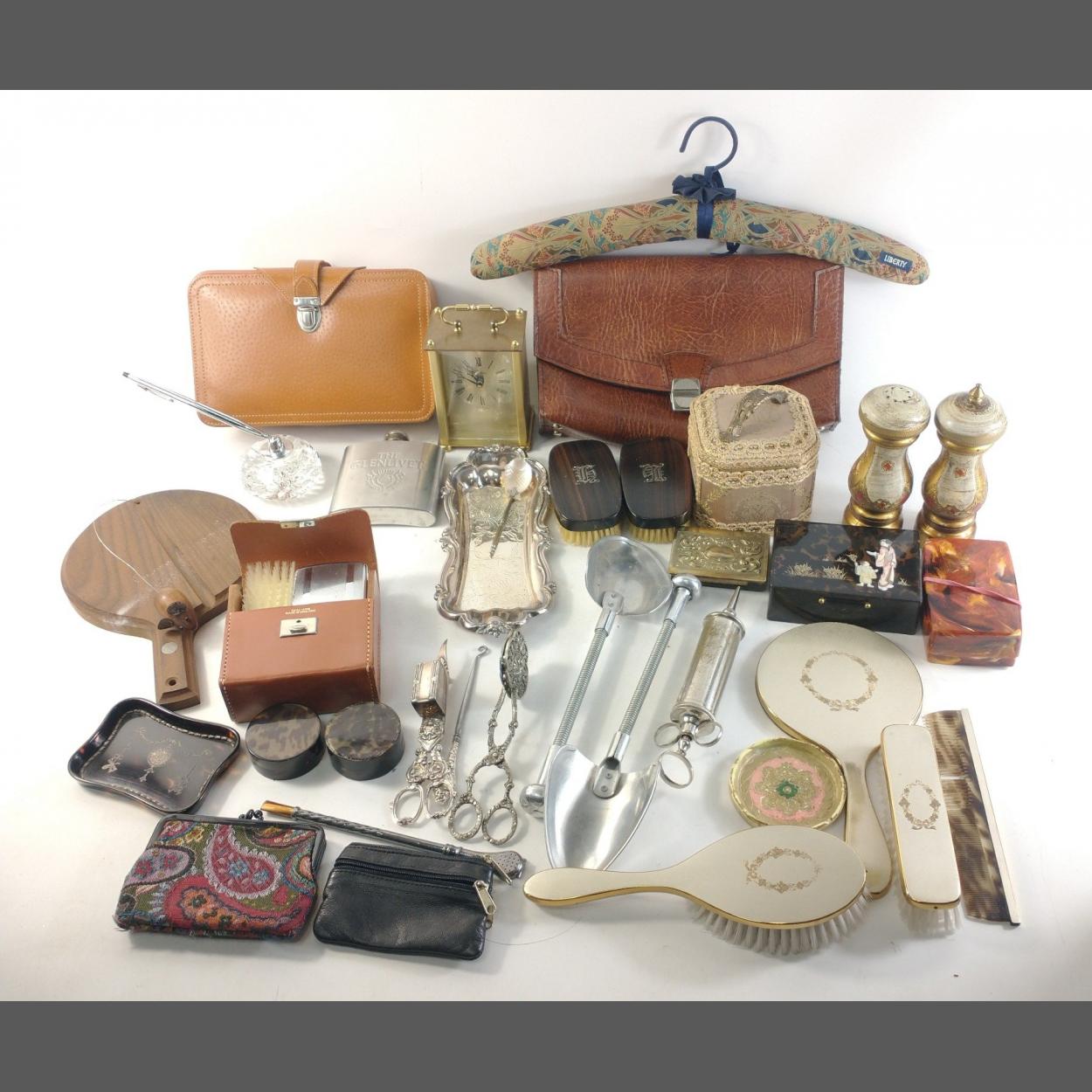 A mixed box to include LIBERTY coat hanger, gilt dressing table set, turtle ware dressing table pots, large size shoe stretchers, pin trays, carry cases, etc