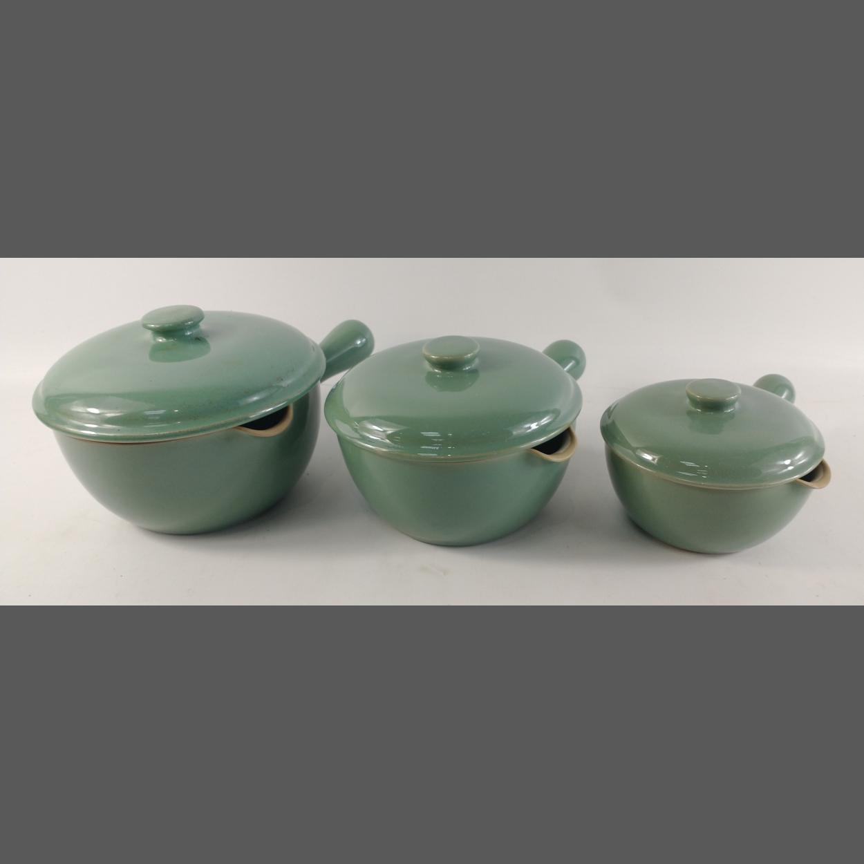 Three vintage DENBY Manor Green pouring saucepans, 1pt, 2pt and 3¼ pts