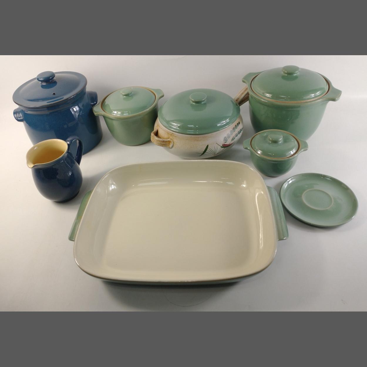 A DENBY Manor Green style stockpot, a blue DENBY stockpot approx 24cm high, a 2pt casserole dish, plus a Manor Green lasagna 37 x 30cm approx etc