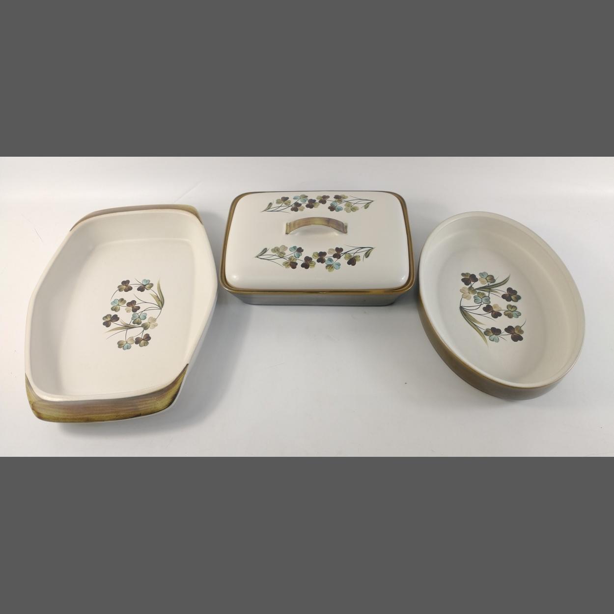 Three items of DENBY cookware to include a twin partitioned lidded vegetable dish, an oval dish (29cm) and a lasagna dish (32cm approx)