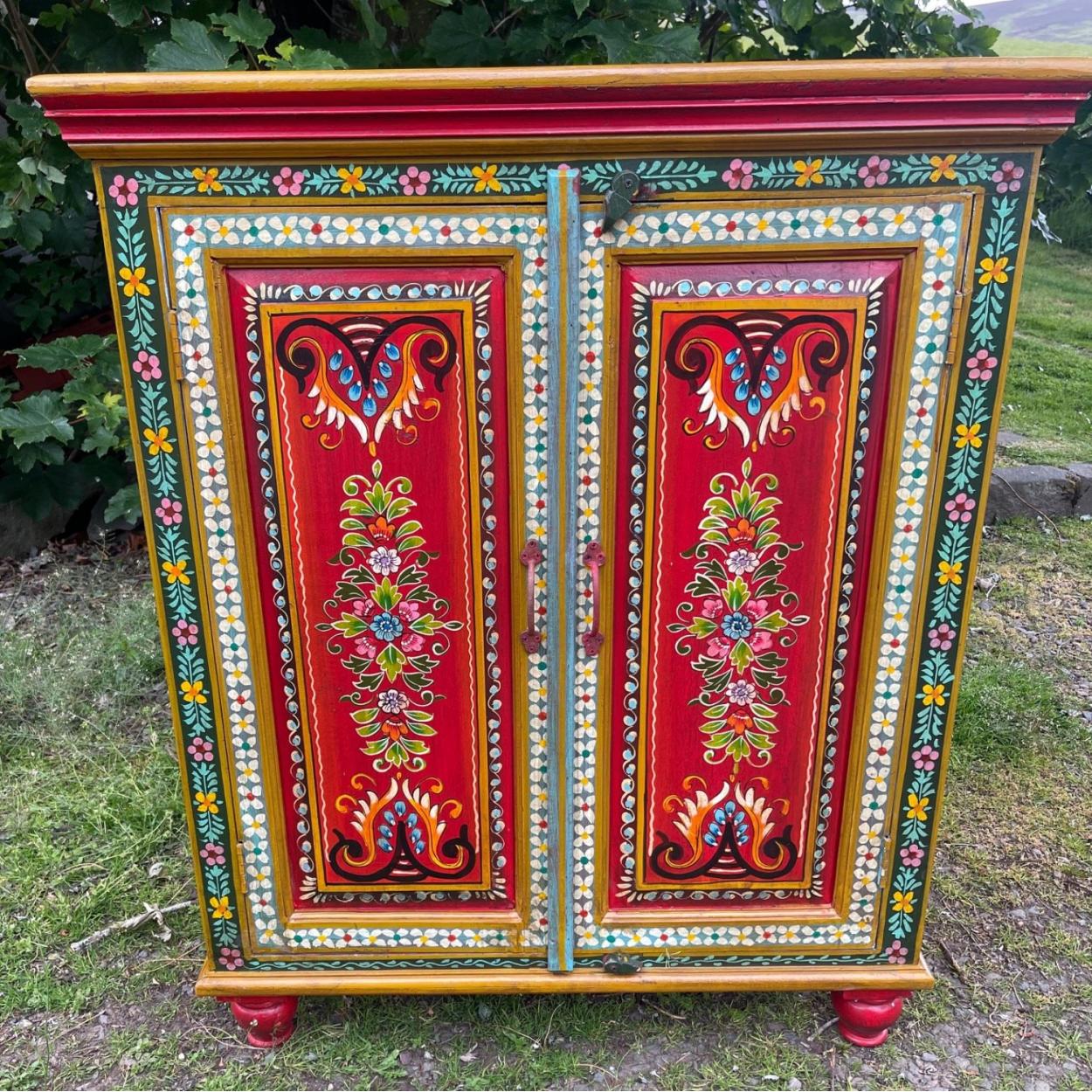 BRAND NEW ITEM UNUSED A RIKISHA hand painted and handmade two door cupboard with 3 shelves - hand painted in a glorious mulberry colour, dimensions 95 x 40 x 110cm approx