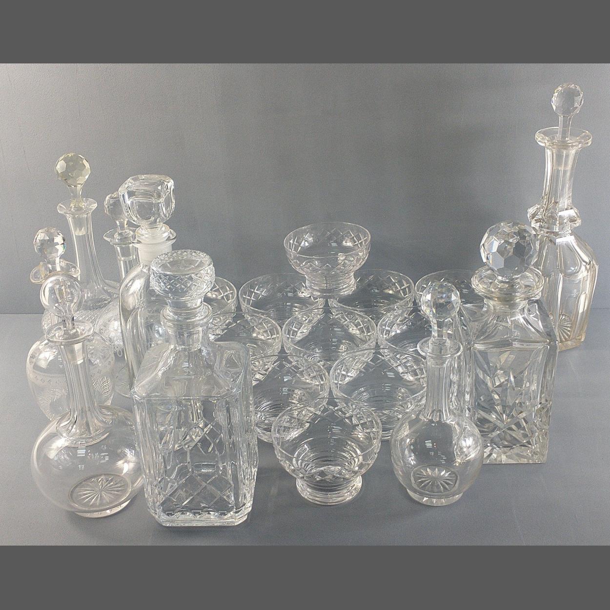 Nine decanters of varying styles, a couple with slight damage plus 11 crystal sundae dishes.