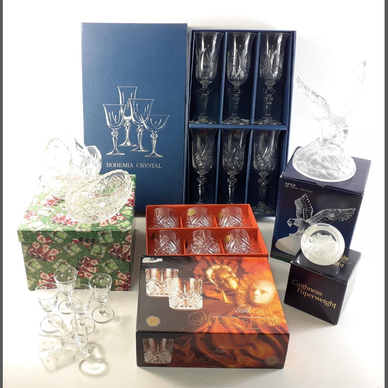 A mixed lot to include 6 boxed BOHEMIAN crystal champagne flutes, crystal baskets, 6 CRYSTAL D'ARQUES whisky tumblers, CRYSTAL D'ARQUES model of an eagle, CAITHNESS paperweight and 6 loose liqueur glasses