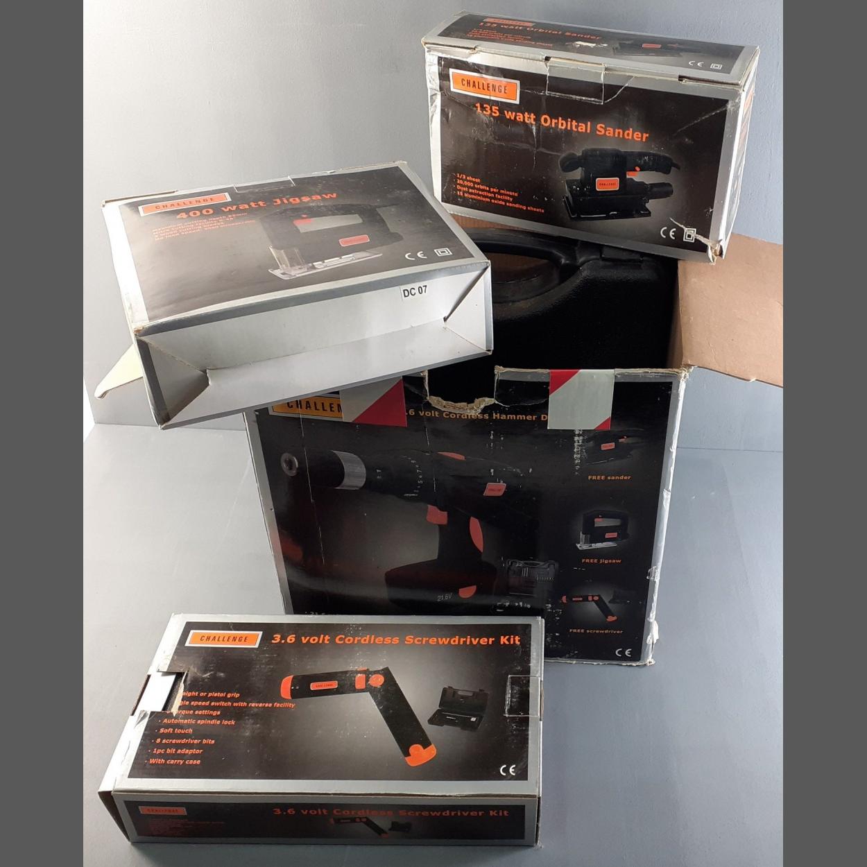 A boxed CHALLENGE cordless hammer drill with sander, screwdriver, jigsaw