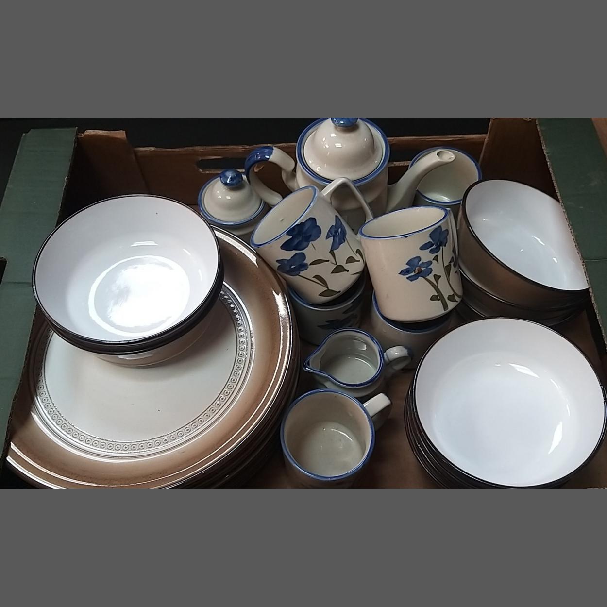 A mixed box to include DENBY soup bowls x 9 and 9 similar dinner plates with a rather nice blue flower pattern coffee set with mugs and a coffee pot etc