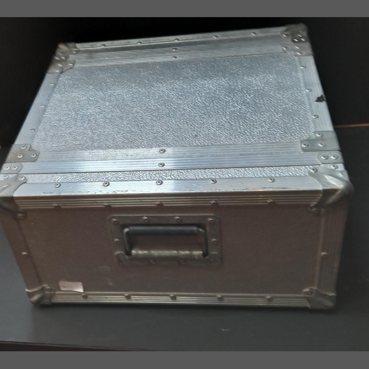 A SUBSTANTIAL ALUMINIUM carry-storage case - depth 50cm x height 50cm x 25cm depth approx