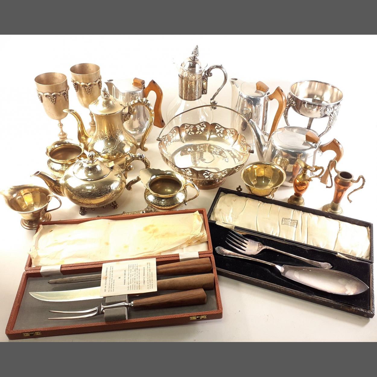 Mixed metal ware lot. Includes Canadian carafe, Picquot Ware tea pots etc. some boxed cutlery etc.