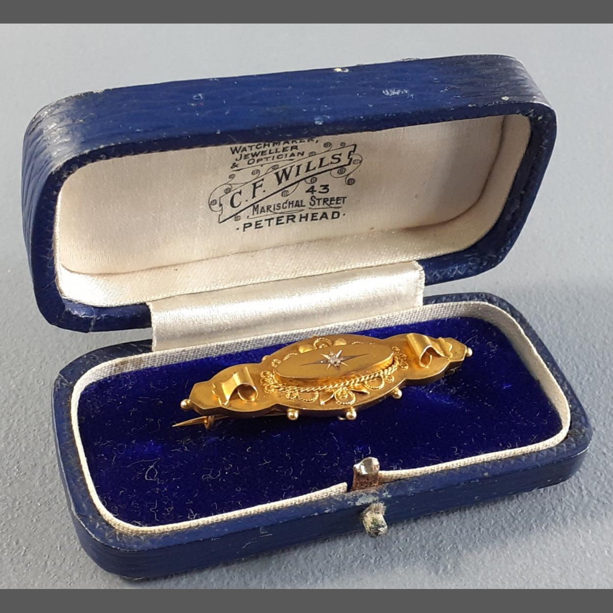 A 9ct stamped vintage mourning brooch in Peterhead jeweller's box. A lovely item in good condition. 4cm approx. Gross weight 3.2g approx