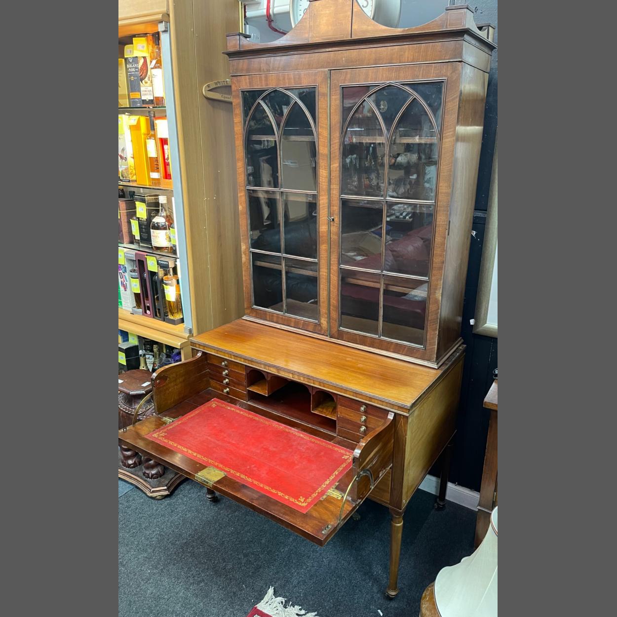 A circa Victorian astral-glazed bookcase with pull-out secretaire lined in red leather drawer with 8 small drawers within , and two smaller drawers all on four leg supports - dimensions 58cm depth x 100 depth x 185cm height approx .