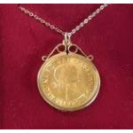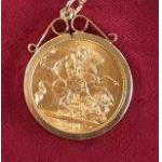 Full 1964 sovereign in 375 gold mount on a unmarked yellow metal chain. Gross weight 10.2g approx