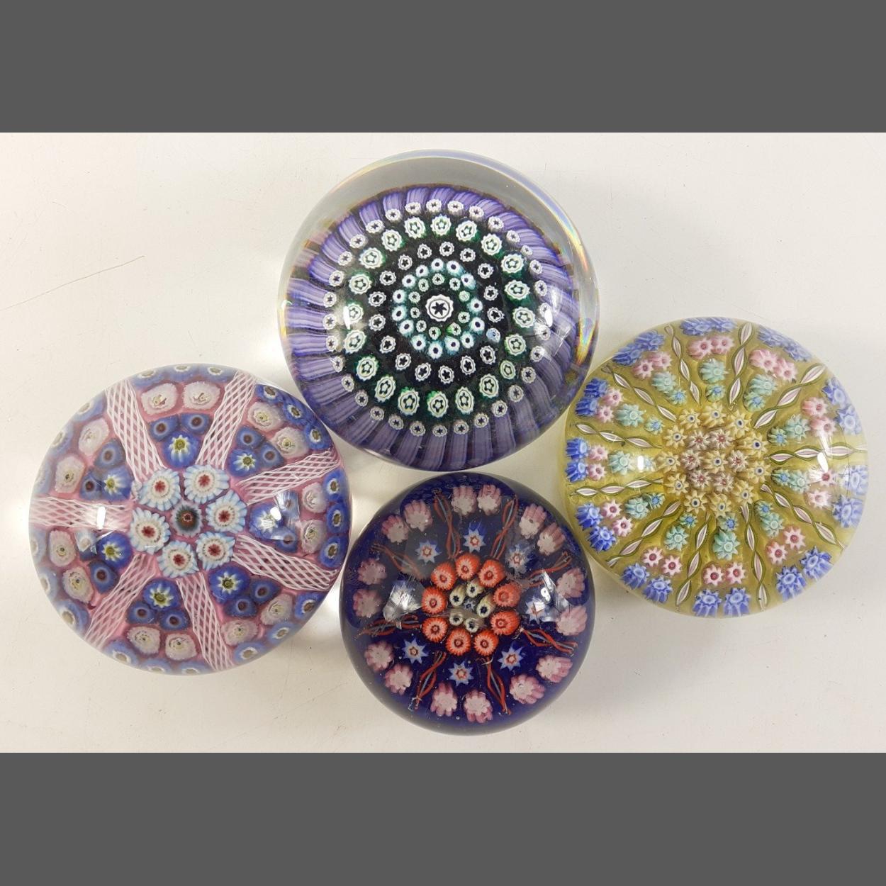 Four wonderful paperweights. All with cane style designs and all in good condition, the largest 8cm approx.