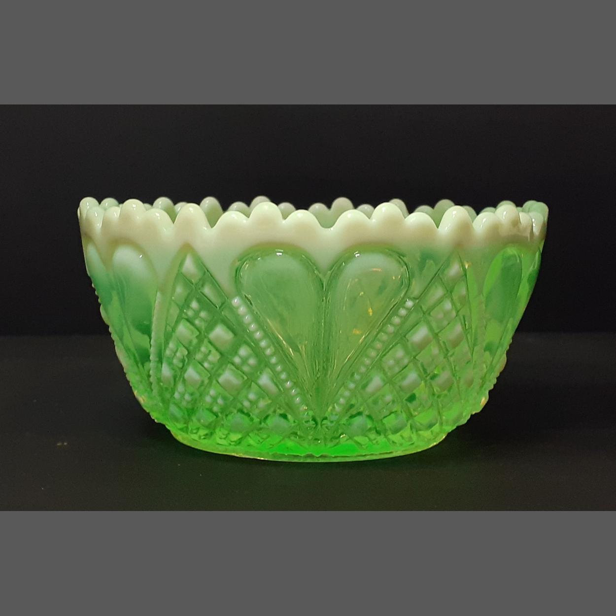 Davidson Primrose Pearline Vaseline / Uranium Glass bowl in lovely condition. 12cm diameter. Glows bright green under light. Made by Davidson ca. 1900, the pattern is known as ''William & Mary''